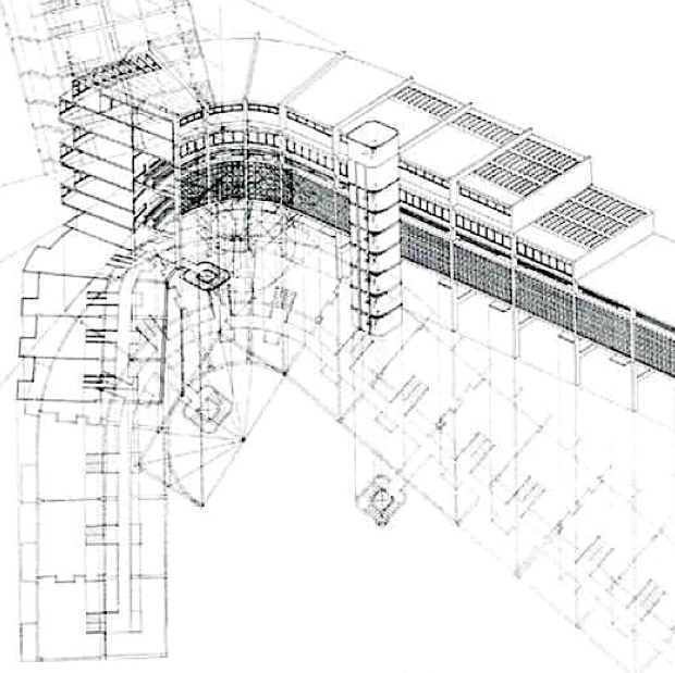 El cubo, en efecto, se origina en el traslado literal de un artefacto conocido: la torre de oficinas que cualquier cliente corporativo desea; pero en él, tras negociar con las ideas de Giurgola formuladas dentro de los límites del movimiento Moderno, Alcock logró insertar un vestíbulo monumental completamente tropical, complementando con la enigmática ventana, la recepción intuitiva de un tradicional esquema de ventilaciones cruzadas y conducción de vientos como el que presentaría, a menor escala, cualquier casa de patio. El claustro del medio cilindro, por su lado, contiene un sorpresivo jardín interior que, como las casas coloniales posee, reinterpretados en pérgolas de hormigón armado, corredores laterales y aleros que lo acondicionan climáticamente. Así, «distanciado del universalismo del estilo internacional» pero a su vez autorizándolo a hablar en estas latitudes, el edificio descifra, «globalmente» y con otros materiales y técnicas, lo que antes era «de nuestro territorio» (Gómez).
