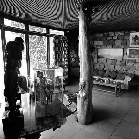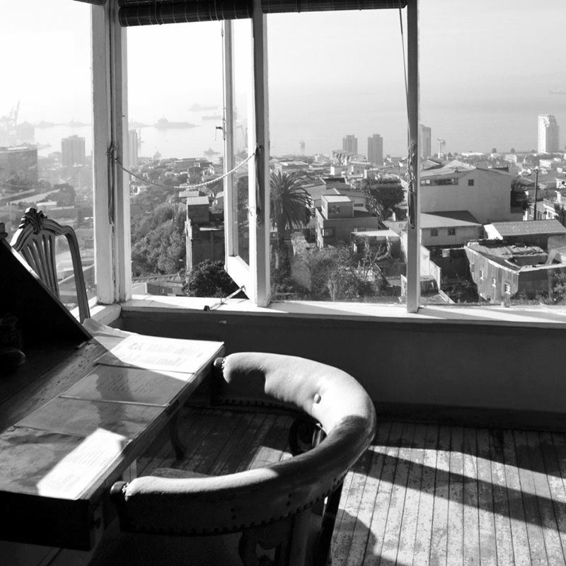Y a medio camino en la línea temporal que une estas dos instalaciones habitables, el poeta Pablo Neruda se hacía construir en Chile esas tres casas que, animadas por el puro impulso que las haría aptas para que el hombre que las iba a habitar escribiese sus versos en ellas, compartieron modos de desplazamiento y permanencia dados, no por otra cosa, que por los eventos que le resultaban a él cruciales: el «cocinar para los amigos», con la cocina y el bar como extensiones del comedor configurando más allá las relaciones con el estudio y los cuartos de huéspedes; el «habitar en un barco», al proveer a las casas techos bajos, pisos de madera, estrechas escaleras empinadas y aberturas simulando escotillas; y el concebirlas como «recipientes» con ubicaciones premeditadas para las cosas que recolectaría en sus viajes. Cada casa, según su peculiar situación, sería configurada de manera única por su ocupante. Isla Negra, recibida a medio hacer, fue completada con un salón de piedra provisto de un gran ventanal y una larga mesa frente a la cual observar la costa y sentarse a escribir. La Chascona en Santiago, en el estar hecha junto a una cascada en una ladera del cerro, encontró la excusa ideal para configurarse como una serie de pabellones unidos mediante un recorrido sinuoso al aire libre; y La Sebastiana en Valparaíso, adquirida inconclusa y deshabitada por «absurda, peligrosa y poco funcional», fue animada por un espacio conector laberíntico unido al cual poder experimentar en ella un habitar «alado pero firme», «solitario pero no en exceso», y «original pero no incómodo».